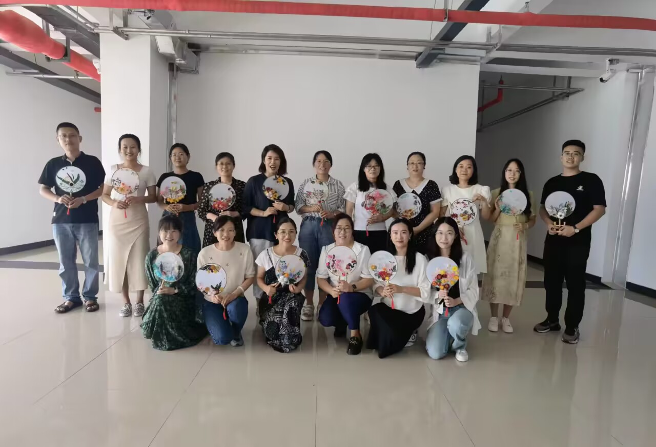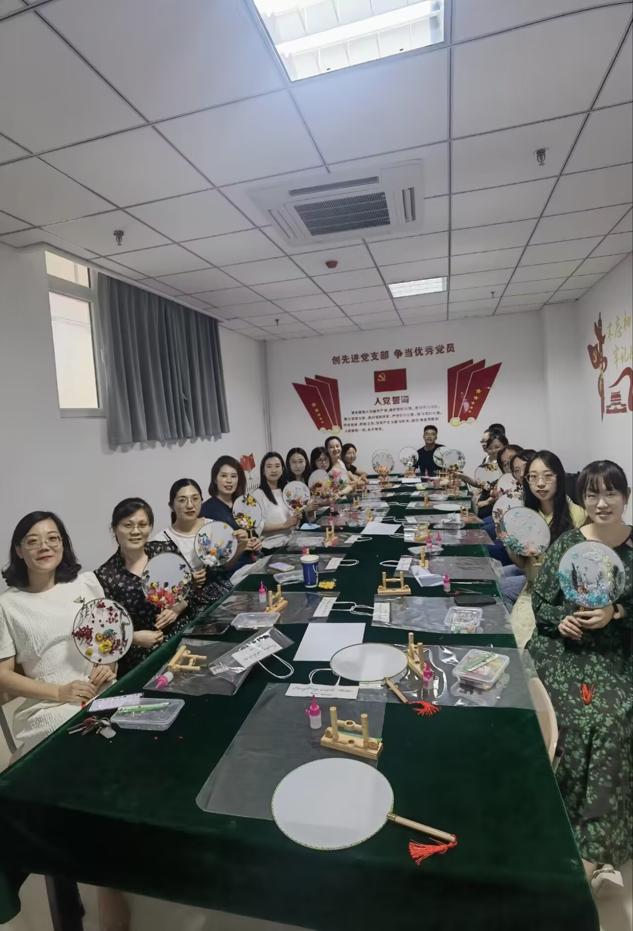 活动伊始,工会主席张爱娜老师向全体教师详细介绍团扇的结构、制作流程及所需材料,并通过精美的成品展示,让大家生动形象地领略了团扇的魅力。随后,大家在老师的指导下,挑选自己喜欢的干花进行装饰,通过折、扭转固定、定型将不同种类的干花呈现出自己喜欢的模样。制作过程中,各位老师充分发挥各自的想象力,用胶水将一束束美丽的干花固定在团扇上,把团扇设计、制作成属于自己独一无二的艺术品。一把把精巧的团扇呈现在大家眼前,老师们用自己灵巧的双手呈现了一场视觉盛宴。最后,老师们手持团扇拍照留念,留下属于自己的美好回忆。
