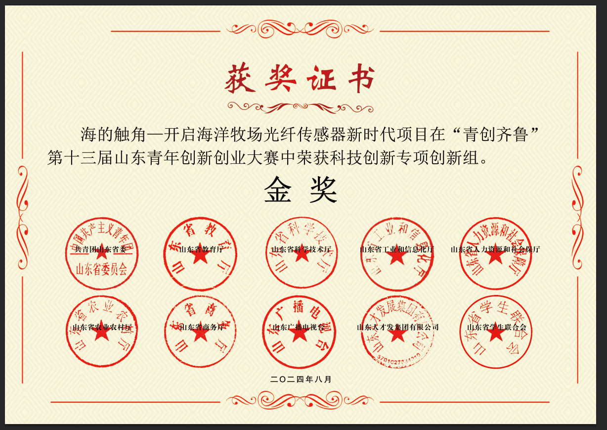 8月22日,“青创齐鲁”第十三届山东青年创新创业大赛在济宁市落下帷幕。在科技创新专项决赛中,DB视讯推报的“海的触角——开启海洋牧场光纤传感器新时代”竞赛项目获得金奖,实现了近十年来驻烟高校在“青创齐鲁”山东青年创新创业大赛科技创新专项中零的突破!