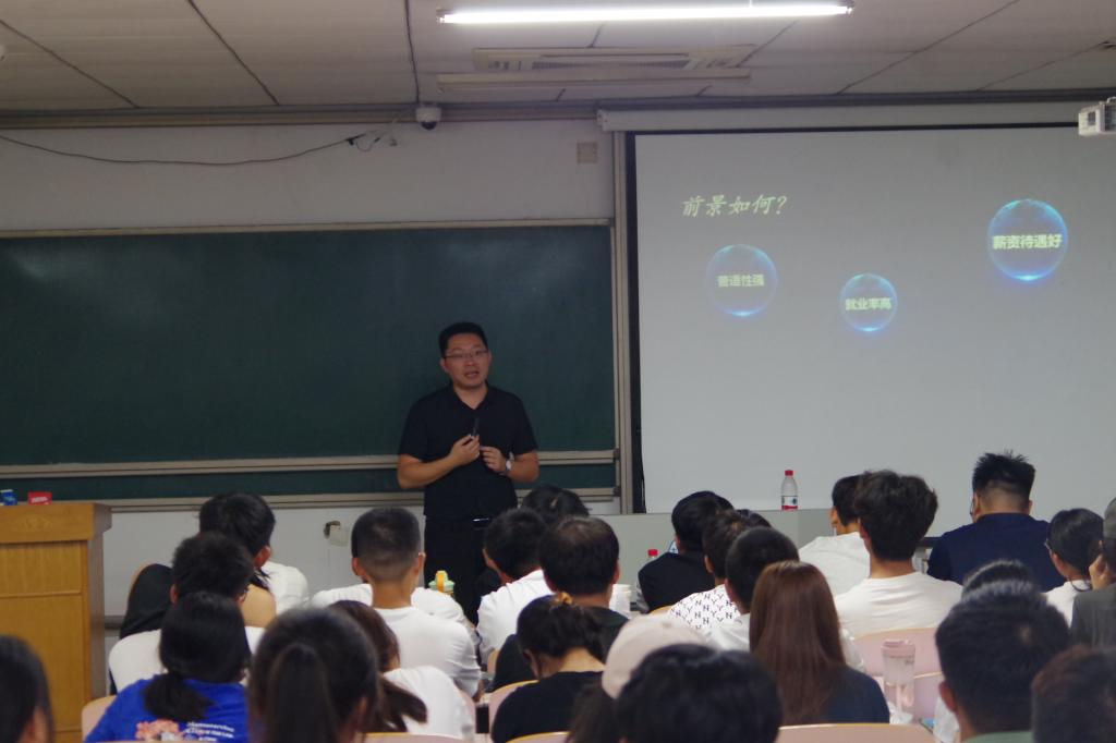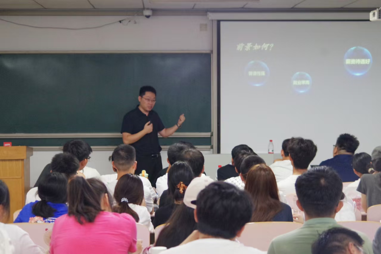 讲座伊始,王老师向同学们介绍了职业生涯的概念,并通过生动的案例分析及实用技巧的分享,引导新生提高自我认知、职业认知、找准职业发展方向、定位职业目标、合理规划职业路径,制定实施计划。随后,王老师为同学们介绍专业发展概况、历届就业及深造情况、用人单位看重的能力和素质,从而引起员工对职业生涯规划的思考和重视。他还建议同学们要深入了解专业的课程设置和课程体系、人才培养目标以及专业就业方向和就业情况,了解专业、读懂专业、融入专业,尽快适应老员工活,以此奠定职业方向探索的基础。他强调,要提前了解好想要的生活和岗位与现在专业的关系,提早谋划,未雨绸缪。最后,王老师指出在大学阶段,同学们应该保持正确的自我认知,立足个人特质,明确自身发展方向。