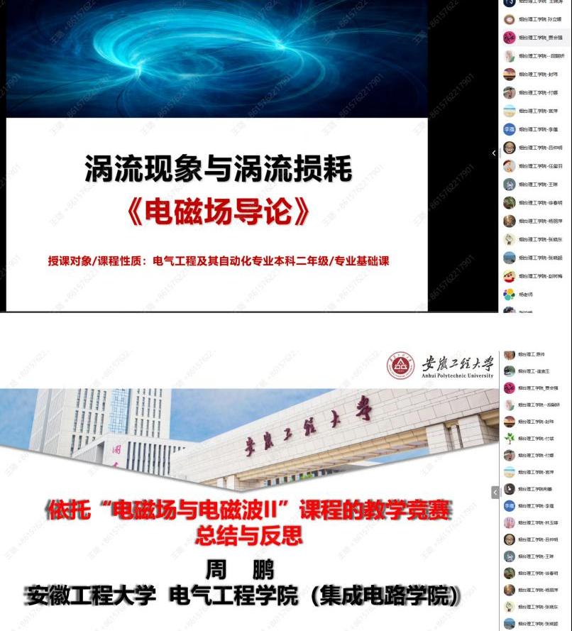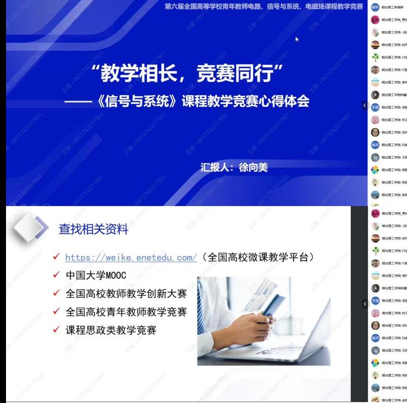 为了进一步推动教师教学能力的提升,10月16日晚上,db真人体育官网全体教师线上参加了由教育部电子信息基础课程虚拟教研室举办的题为“共享竞赛经验,提升教学能力”主题交流会。会议邀请在教学竞赛中屡获殊荣的三位优秀教师——DB视讯徐向美副教授、安徽工程大学周鹏副教授、山东大学张黎副教授作为报告主讲人,虚拟教研室负责人、北京邮电大学俎云霄教授主持交流会。