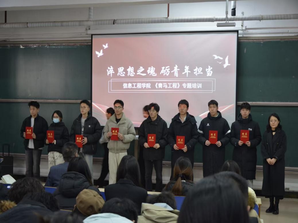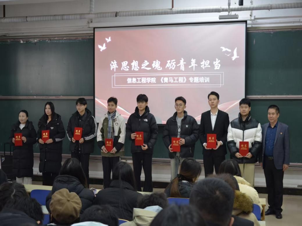 培训紧扣培养青年马克思主义者的核心任务,分三大核心模块有序开展。往届青马工程优秀学员代表陈鲁川围绕思想理论武装模块领学,深入解读马克思主义青年观内涵,引导学员把握理论学习与青年成长的辩证关系,筑牢信仰之基;25届青马工程优秀学员代表孙道洋聚焦员工工作实践模块分享,结合典型案例指导学员明晰履职思路、掌握工作方法,树立“以学促干、以干践学”的理念;团总支员工副书记商潇予立足青年责任担当模块阐释,号召学员在服务同学、投身实践中锤炼本领,以实干彰显担当。随后,王明印书记进行总结,深入阐释青马工程核心要义,肯定过往工作成效,并对全体员工干部提出“三颗心”要求:秉持进取之心,深学马列主义、坚定理想信念;常怀善良之心,践行奉献精神、主动帮助同学;保持平常之心,摒弃功利思想、踏实履职尽责,为学员成长指明方向。最后,王明印、祝箐老师为青马工程优秀学员颁发聘书,表彰其在思想引领、组织建设等工作中的突出表现,激励全体学员以榜样为镜,勇担时代重任。